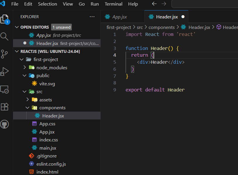 Create a Header.jsx file in the components folder and add code like this.