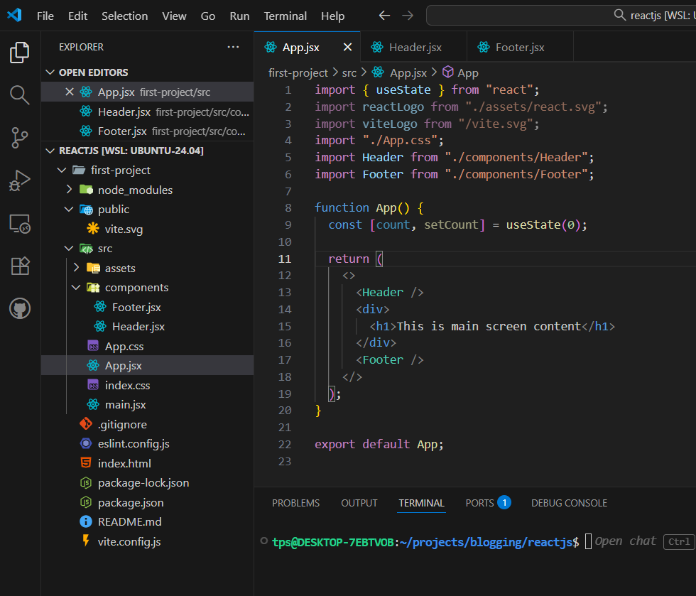 Remove the existing content of App.jsx and add Header and Footer like this.